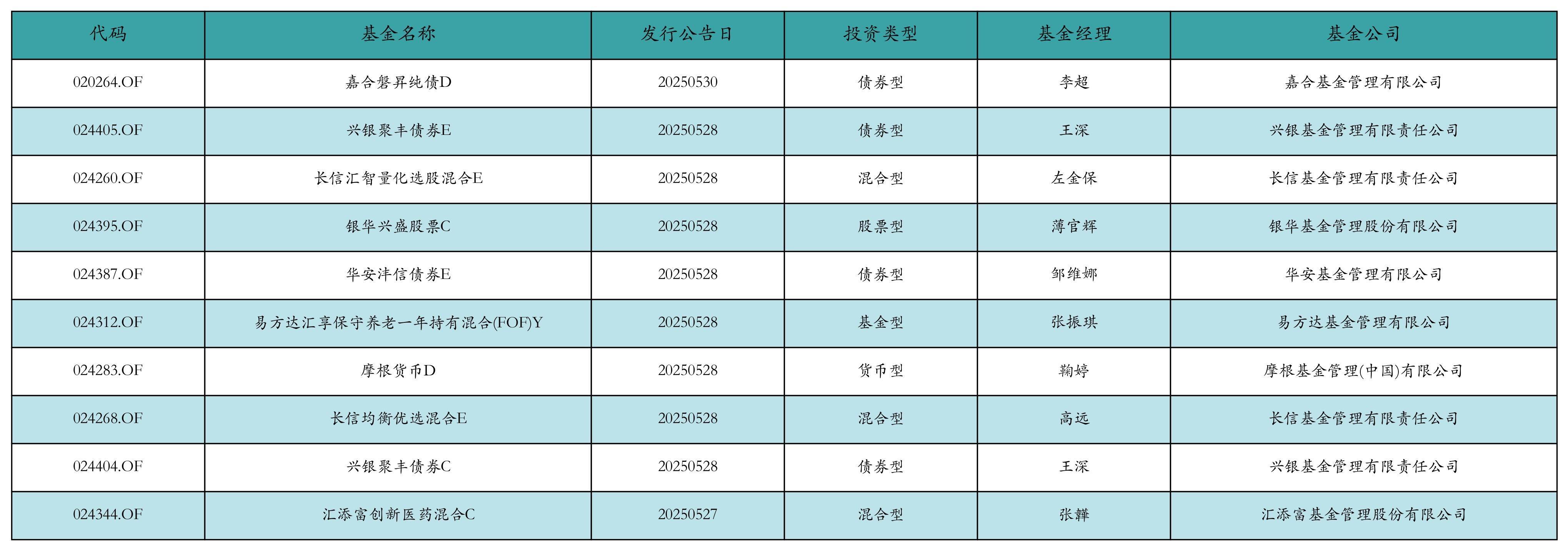 上周有10只新基金发行,分别为:嘉合磐昇纯债D、兴银聚丰债券E、长信汇智量化选股混合E、银华兴盛股票C、华安沣信债券E、易方达汇享保守养老一年持有混合(FOF)Y、摩根货币D、长信均衡优选混合E、兴银聚丰债券C、汇添富创新医药混合C,详情见下表: