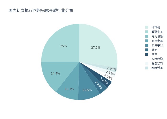 按照初次执行金额所在不同行业分布,金额最高的3个行业分别为:计算机、基础化工、电力设备,详情见下图: