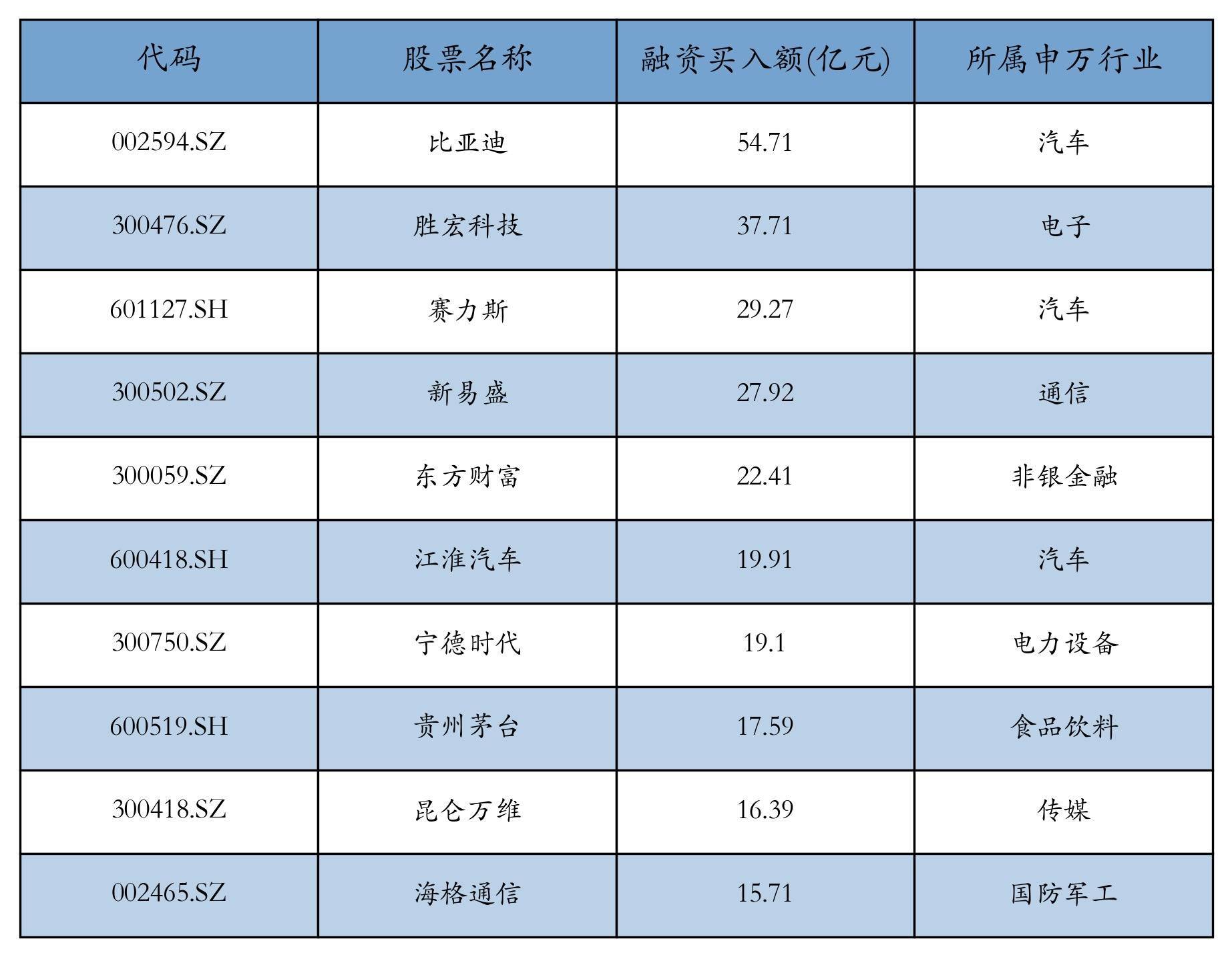 上周两市共有3402只个股有融资资金买入配资炒股入配资平台,共有25只个股买入金额超10亿元,其中比亚迪、胜宏科技、赛力斯排名前三,买入金额分别54.71亿元、37.71亿元、29.27亿元。融资买入额前10个股详情见下表: