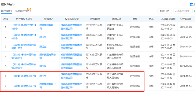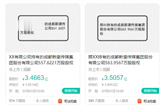 具体来看,这两笔股权分别属于XX有限公司持有的新潮传媒557.6221万股股权,以及顾XX持有的新潮传媒563.9567万股股权,合计1121.58万股,起拍价分别为3.47亿元、3.51亿元,评估价分别为3.85亿元、3.90亿元。
