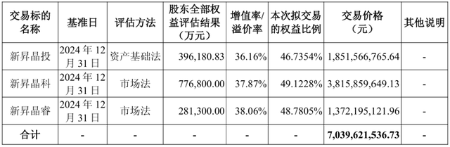 关于交易金额,公告称,本次交易采用资产基础法和市场法对新昇晶投、新昇晶科、新昇晶睿进行评估,根据评估结果,截至2024年12月31日,新昇晶投股东全部权益的评估值为396,180.83万元,评估增值率为36.16%;新昇晶科股东全部权益的评估值为776,800.00 万元,评估增值率为37.87%;新昇晶睿股东全部权益的评估值为 281,300.00 万元,评估增值率为38.06%。