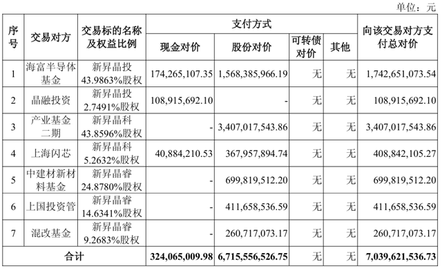 基于上述评估结果,经交易双方协商一致,新昇晶投46.7354%股权的交易价格为1,851,566,765.64元,新昇晶科49.1228%股权的交易价格为3,815,859,649.13元,新昇晶睿48.7805%股权的交易价格为1,372,195,121.96元。沪硅产业拟通过发行股份及支付现金的方式支付本次重组交易对价,其中以发行股份的方式支付对价 6,715,556,526.75 元,以支付现金的方式支付对价324,065,009.98元。
